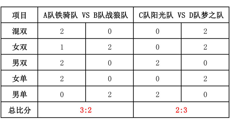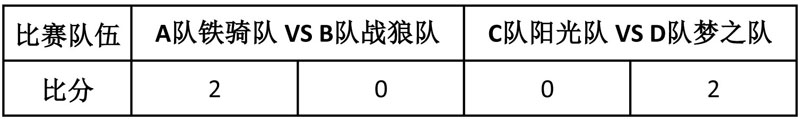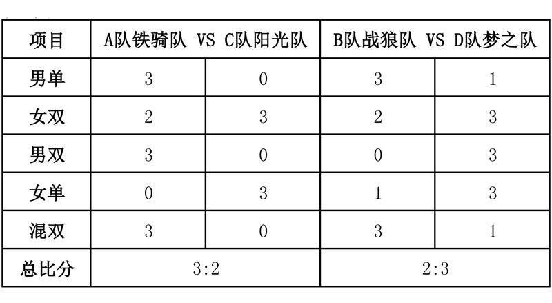 2017年9月28日,在公司車間內(nèi)舉辦乒乓球第二輪循環(huán)賽,由A隊鐵騎隊對戰(zhàn)C隊陽光隊,B隊?wèi)?zhàn)狼隊對戰(zhàn)D隊夢之隊,賽果如下:
