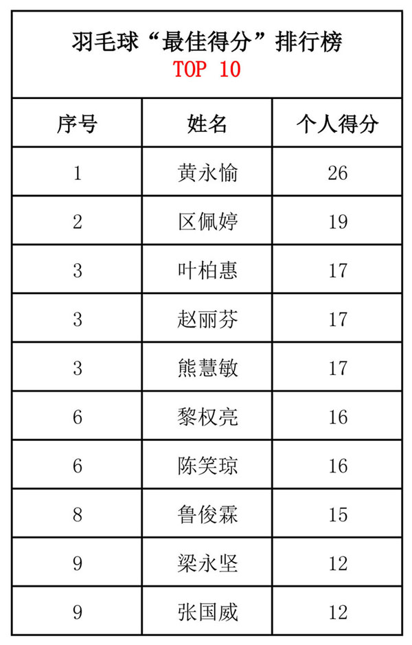 本屆運動會羽毛球賽根據(jù)凈勝球決定“最佳得分”球員,目前排名如下:
