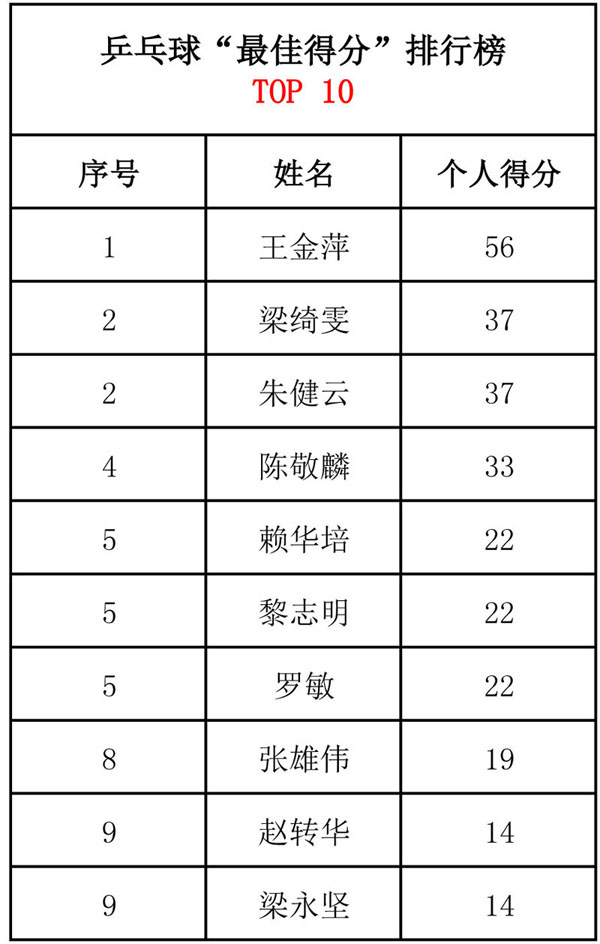 本屆運動會乒乓球賽根據(jù)凈勝球決定“最佳得分”球員,目前排名如下: